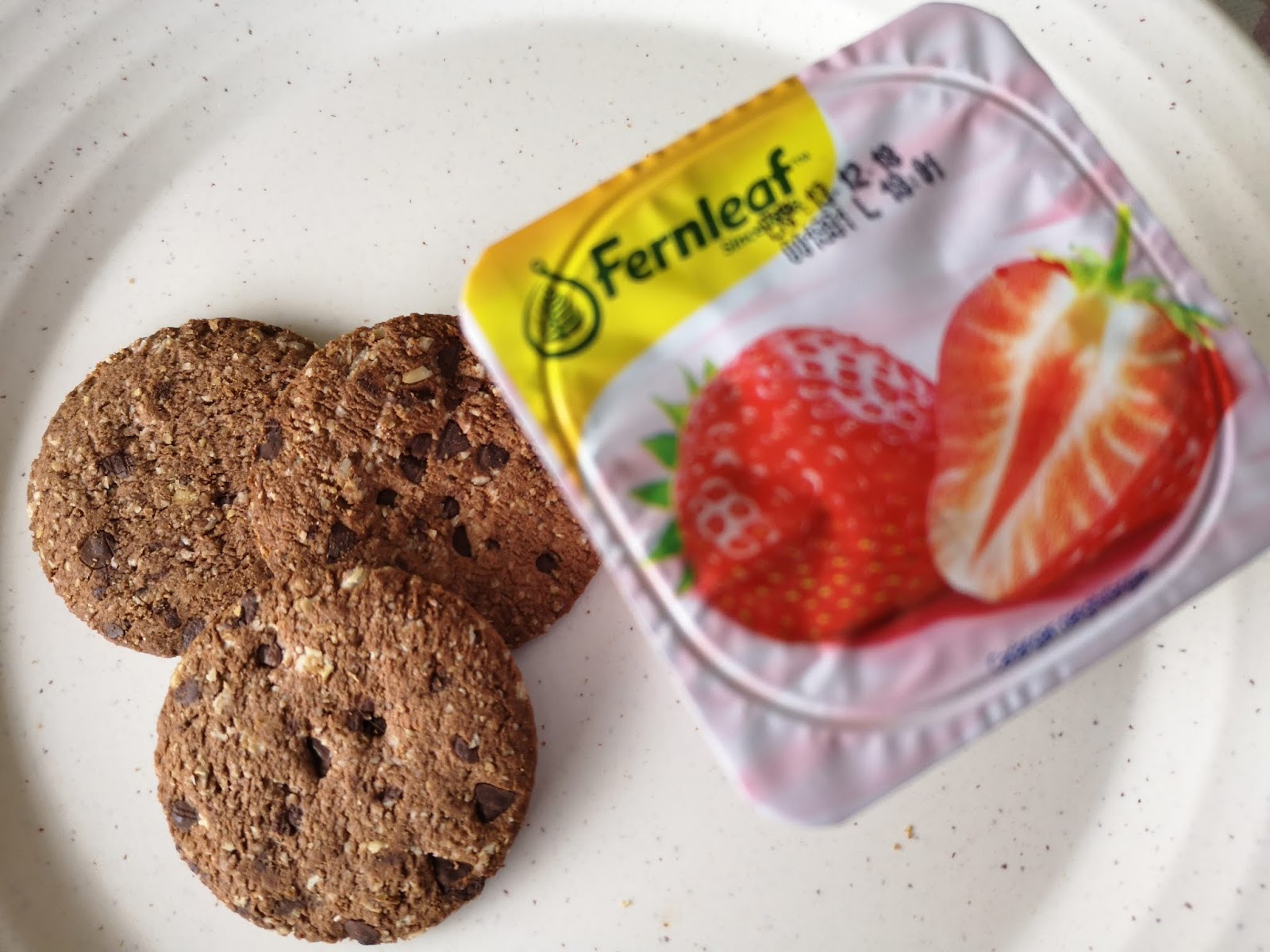Untuk hari ketiga pula, breakfast Mimi makan tiga keping biskut Oat Krunch dan Fernleaf Yogurt Strawberi . Makan biskut oat 3 keping dan yogurt pun dah kenyang sebenarnya. Makan pula dengan yogurt memang bertambah kenyang .