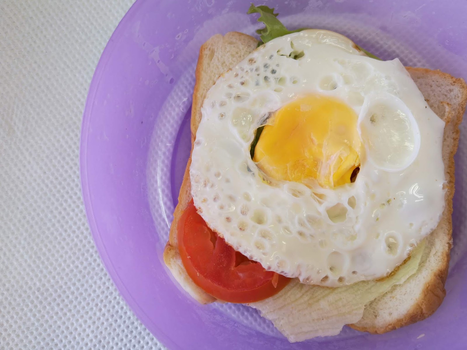 Hari keempat pula bawa bekal sandwich. Roti plain sekeping, telur mata masak tanpa minyak. Cara masak telur tu ,masukkan telur ke dalam kuali yang panas Kemudian tutup sekejap kuali dengsn penutup periuk. So telur akan masak sebab haba yang terperangkap tu mempercepatkan proses masak .Letak roti, salad, tomato dan telur. Kenyang je makan macam ni. Kalau roti wheat bolehlah makan dua keping. Kalau roti plain makan sekeping saja.